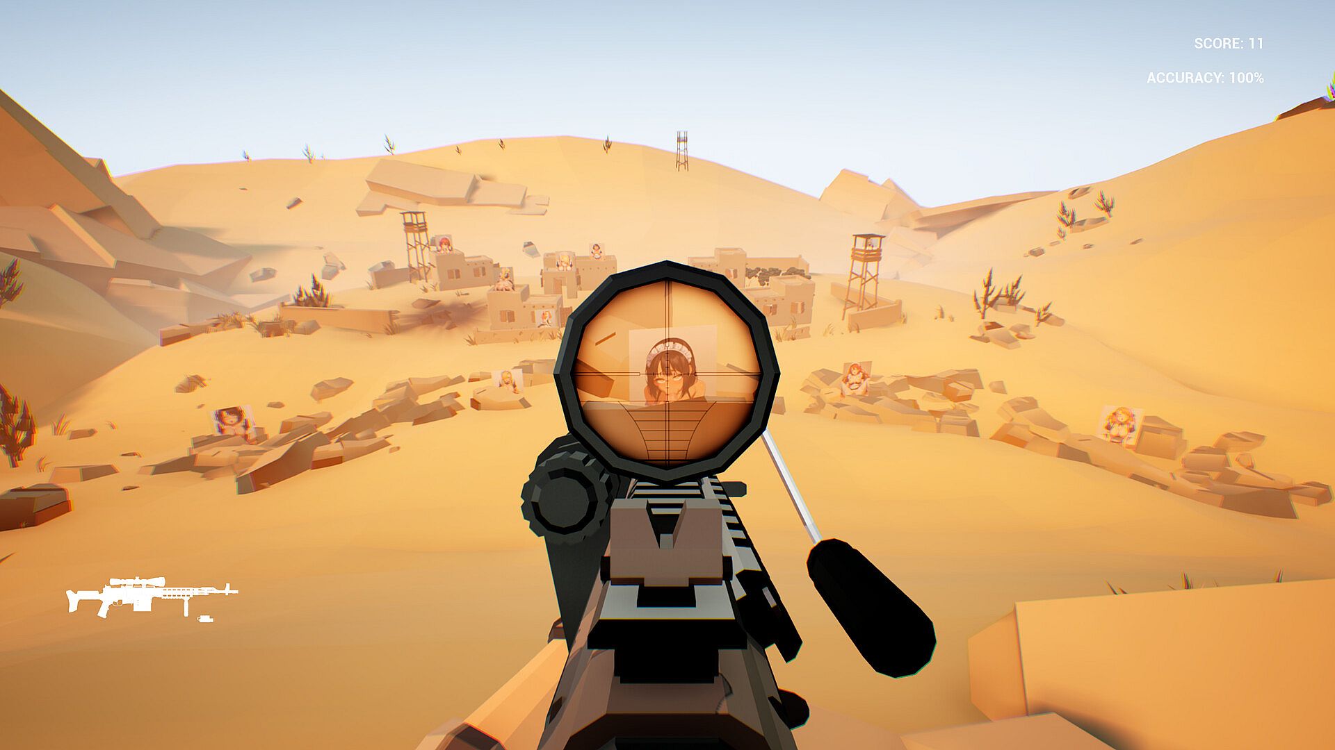 Train your aim precision while gooning to sexy maids and climb the leaderboards. Pick from three distinct maps, including firing range, close quarters, and sniper levels, to sharpen your skills. Grab one of over eight weapons and fire away at fully animated videos, tracking your score and accuracy with built-in meters.