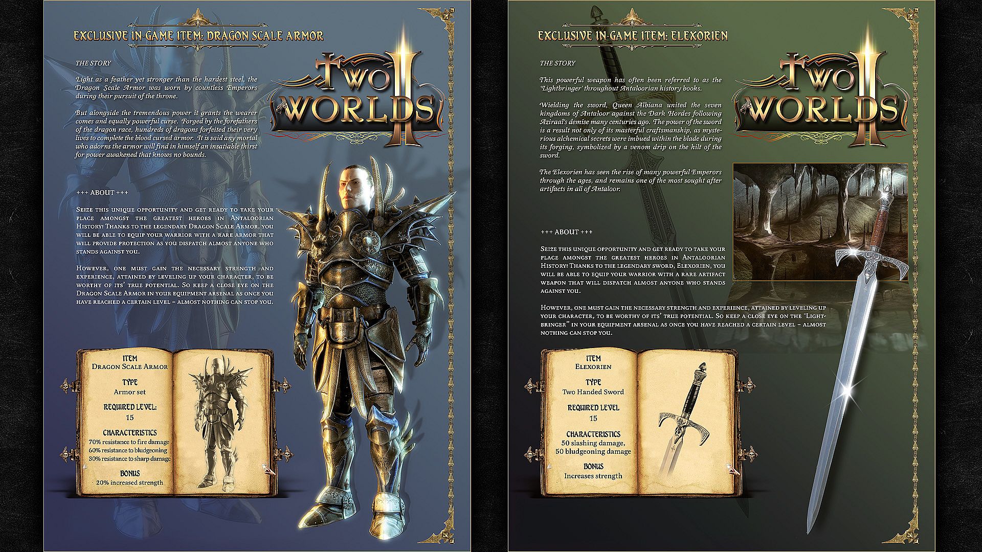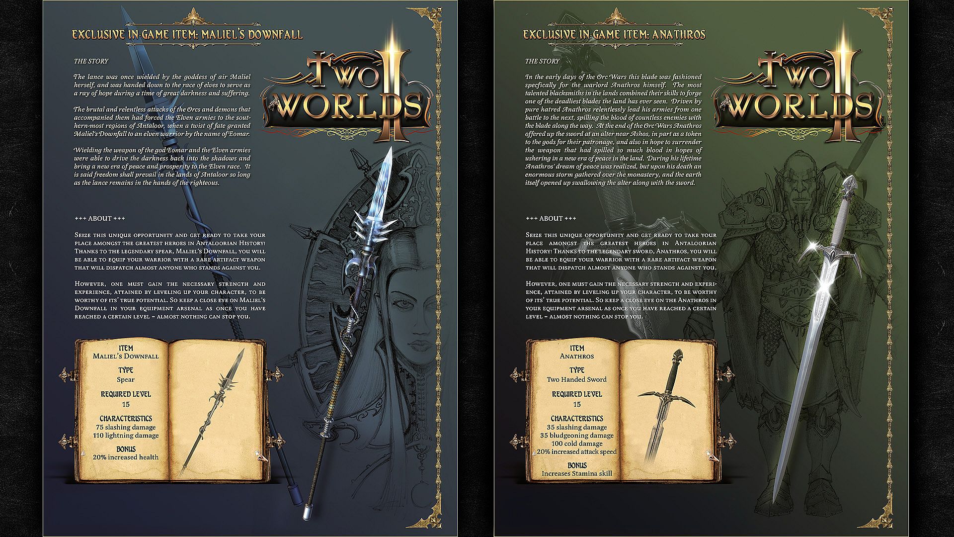 • Two Worlds II Bonus Items (Anatros Sword, Elexorian Sword, Maliel´s Downfall Speer, Dragon Scale Armor, Dusty Scroll Labyrinth Map)