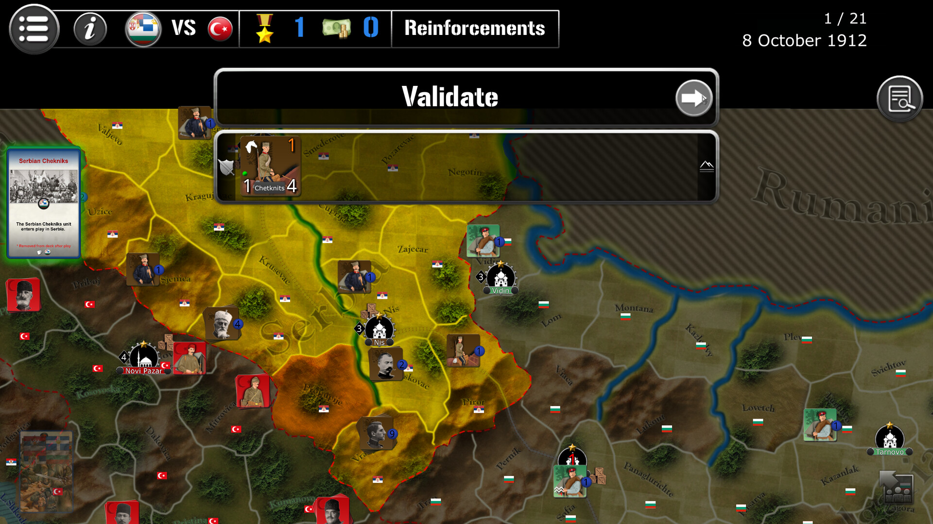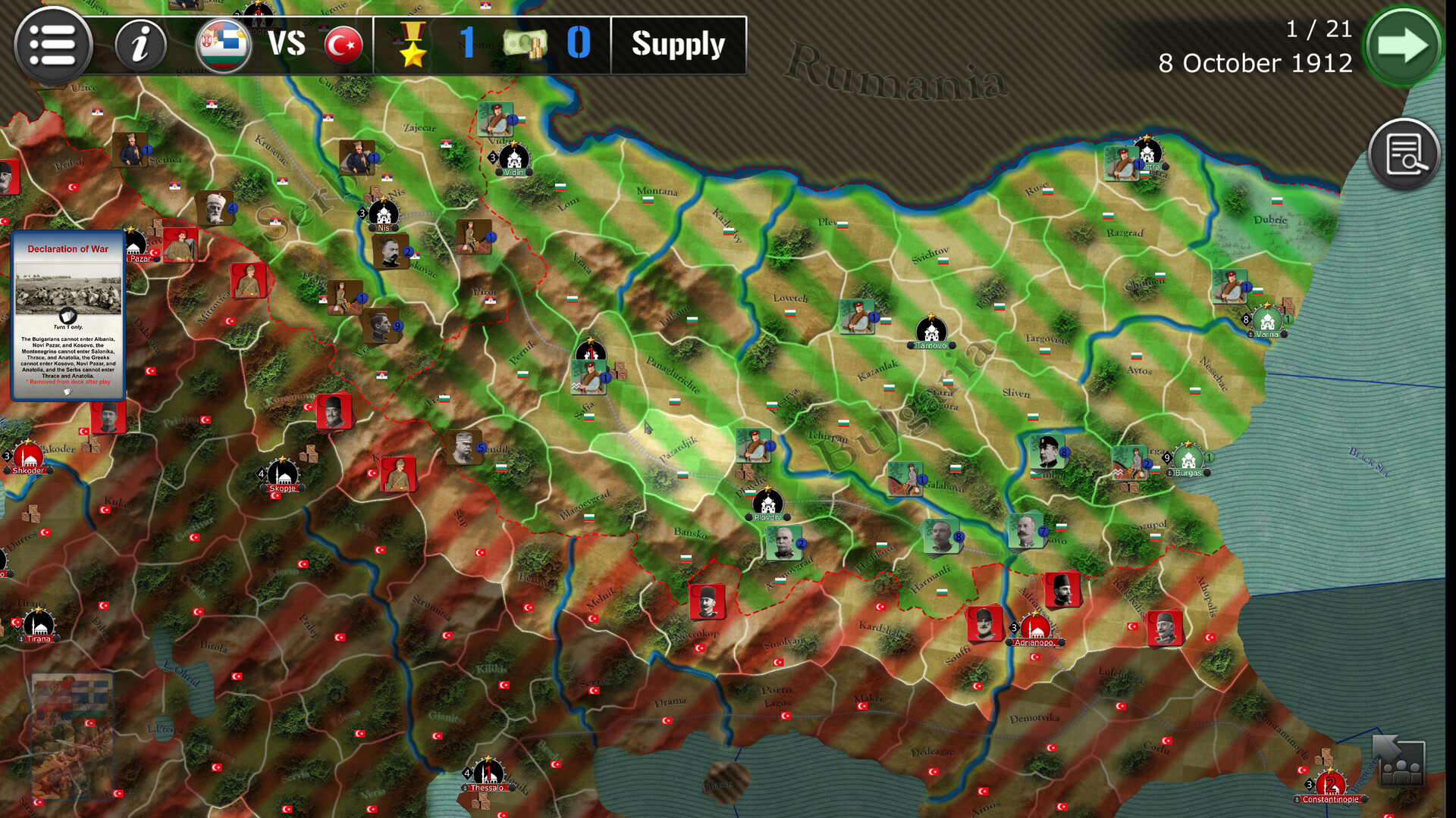 Balkans 1912 retraces the first Balkan War, which pitted the new Balkan states (Bulgaria, Serbia, Greece and Montenegro) allied together in a Coalition and eager to expand their territories at the expense of the declining Ottoman Empire. The Coalition player must quickly seize the entire Balkans. The Ottoman (Turkish) player must try to repel the multiple assaults and, above all, hold on to Istanbul.