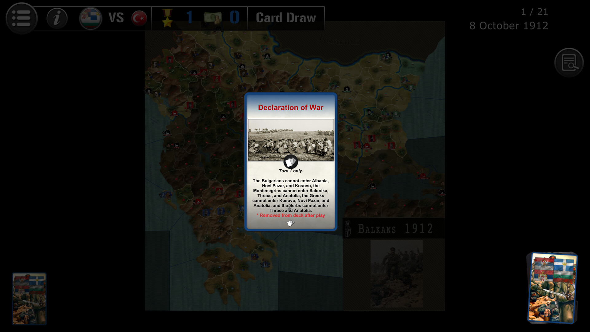 Balkans 1912 is played over 21 turns (each representing 10 days between October 8, 1912 and April 23, 1913). It features two players, one controlling the army and fleet of the old Ottoman Turkish Empire in Europe, the other the armies and fleets of the Serbian, Montenegrin, Bulgarian and Greek governments.