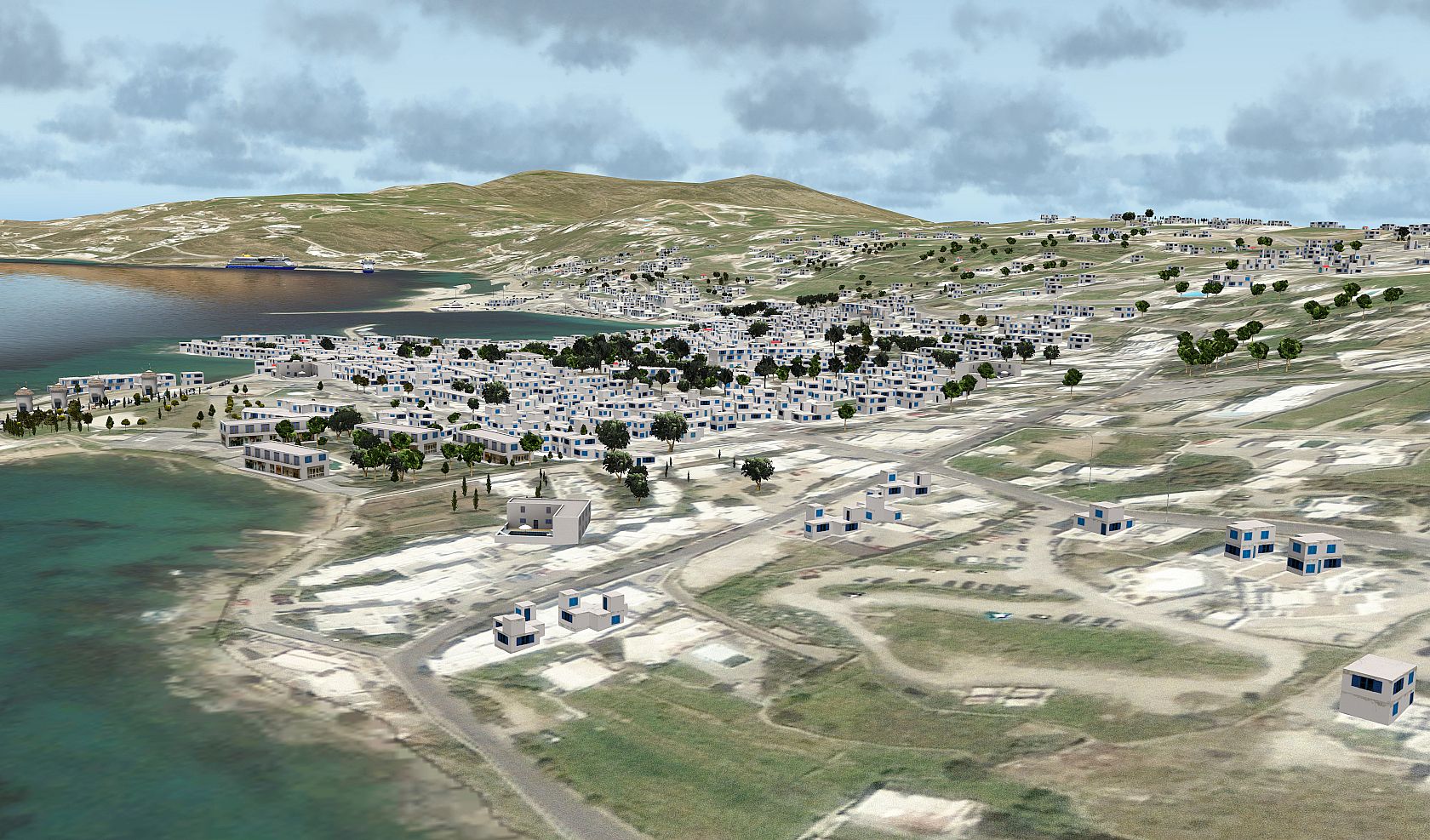 All important landmarks are realistically and accurately created. The town is a highly detailed scene with over one thousand hand-placed buildings and hundreds of trees to provide the characteristic look of Mykonos.