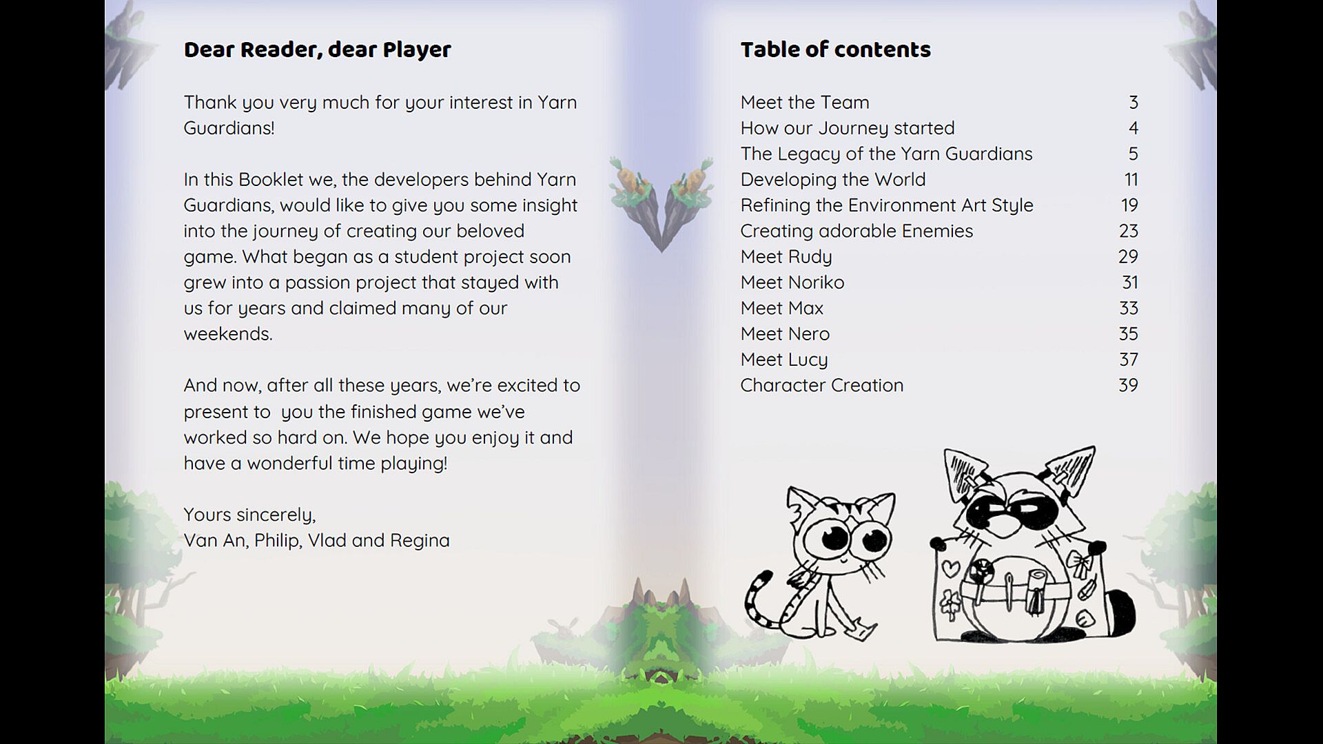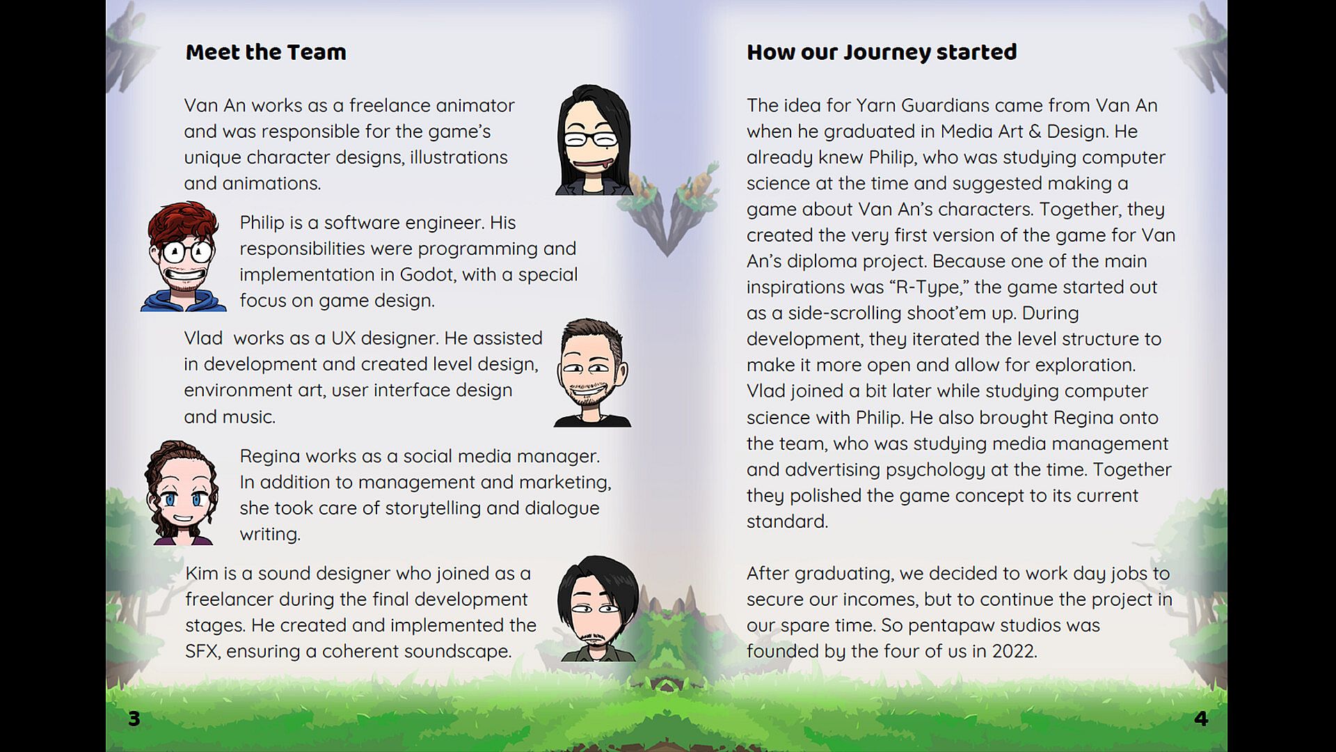 • Meet the Team: Learn how Pentapaw Studios formed in 2022 and see the key contributors—Van An (animation & character design), Philip (programming & game design), Vlad (environment art & UX), Regina (story & dialogue), and Kim (sound design) Yarn Guardians Booklet.