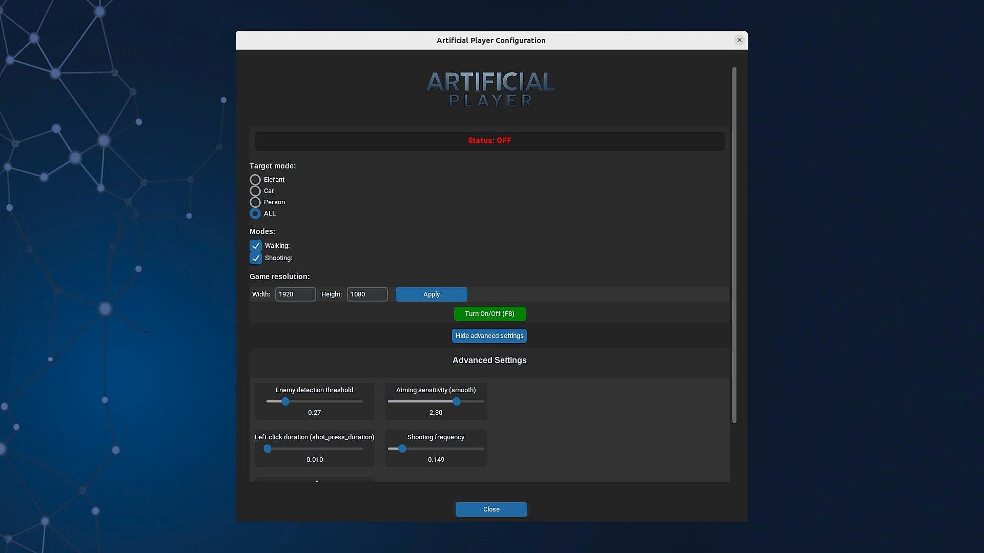 Artificial Player is an advanced tool that lets you create and run artificial intelligence agents that control games like a human would — using the mouse and keyboard.