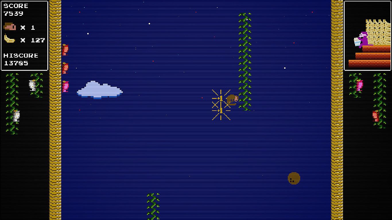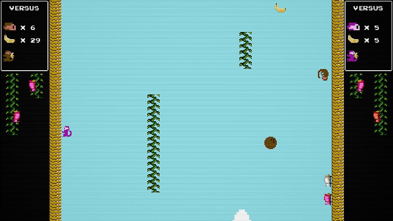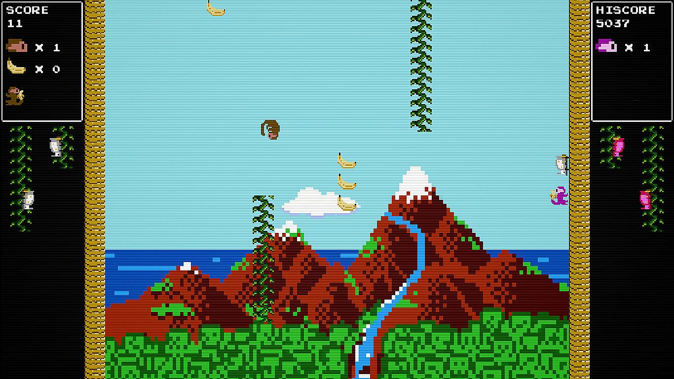 P臋d藕 przez niesko艅czone pionowe wyzwania w tym retro arcade endless runnerze, unikaj膮c proceduralnie generowanych przeszk贸d jak insekty i kokosy. Gracze wspinaj膮 si臋 coraz wy偶ej, zbieraj膮 bananosy, by windowa膰 wyniki, i przyci膮gaj膮 partnera, kt贸ry ratuje ich z opresji lub staje do walki w trybie versus. Retro pikselowa grafika i chiptune'owe melodie oddaj膮 ducha klasyk贸w z lat 80.