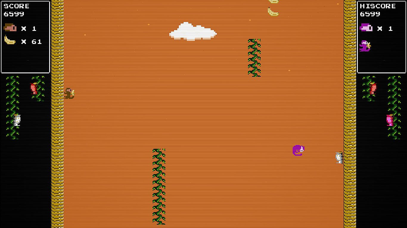 Banano Bros is a retro arcade game inspired by the old time classics of the 80's. This game is a vertical endless runner with procedurally generated obstacles where your only goal is trying to beat your own record and playing with your friends.