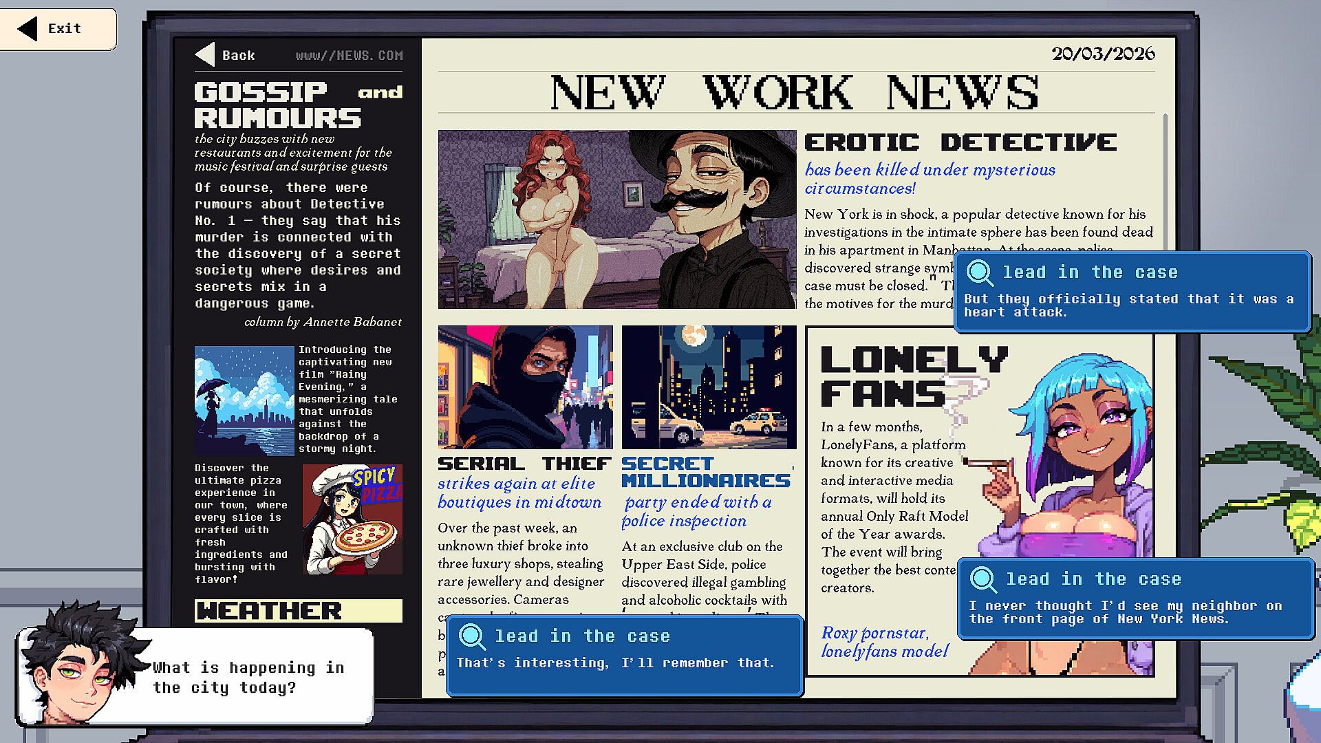 Guilty Pleasures combines elements of detective investigation, a sandbox, and an interactive thriller.