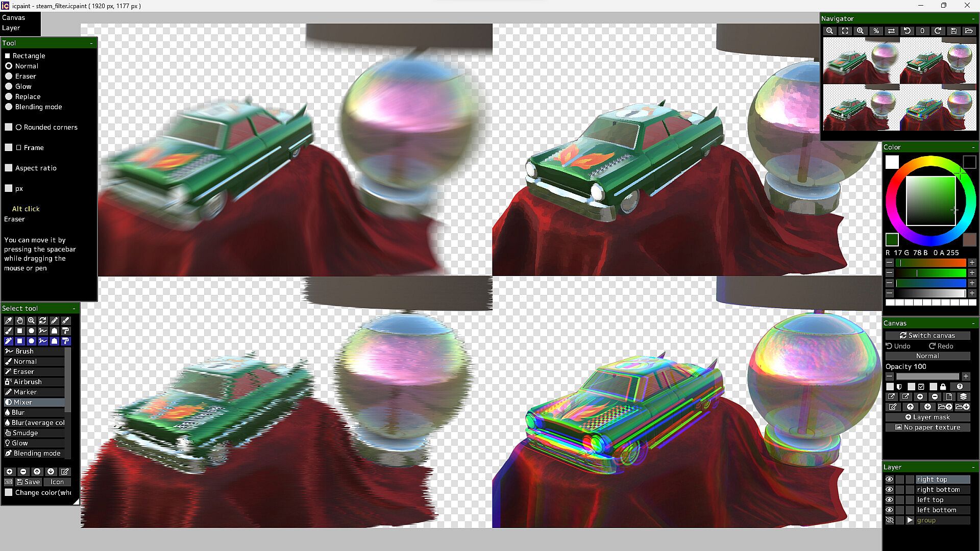 - Brush modes (Normal, Eraser, Marker, Mixer, Blur, Blur(average color), Smudge, Glow, Blending mode)