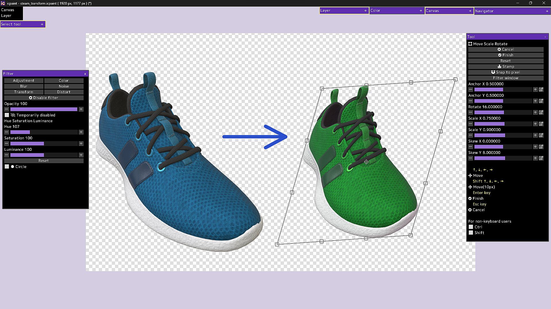 - Save/Open psd, png, jpg, bmp, tga, tif, webp and gif