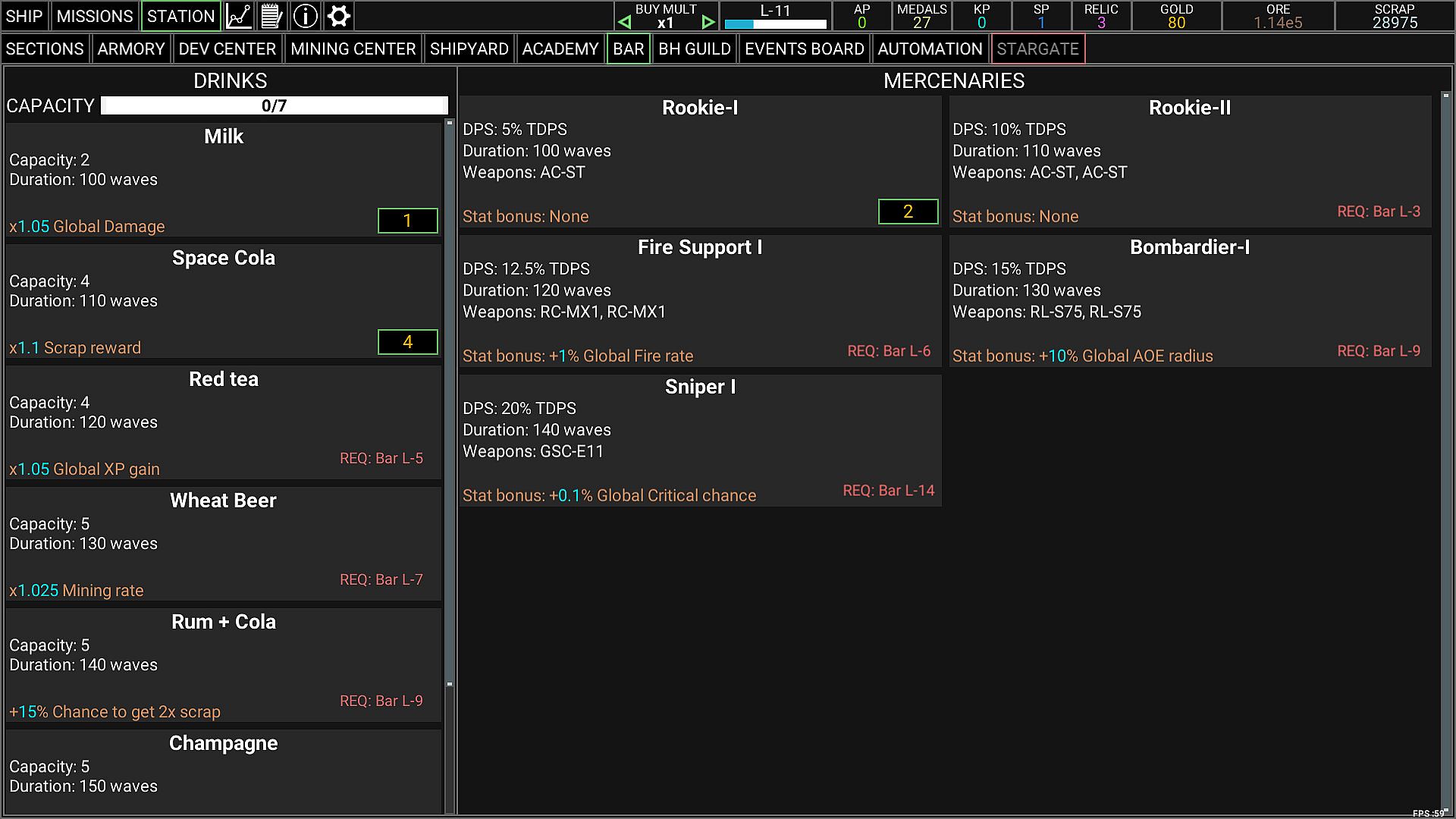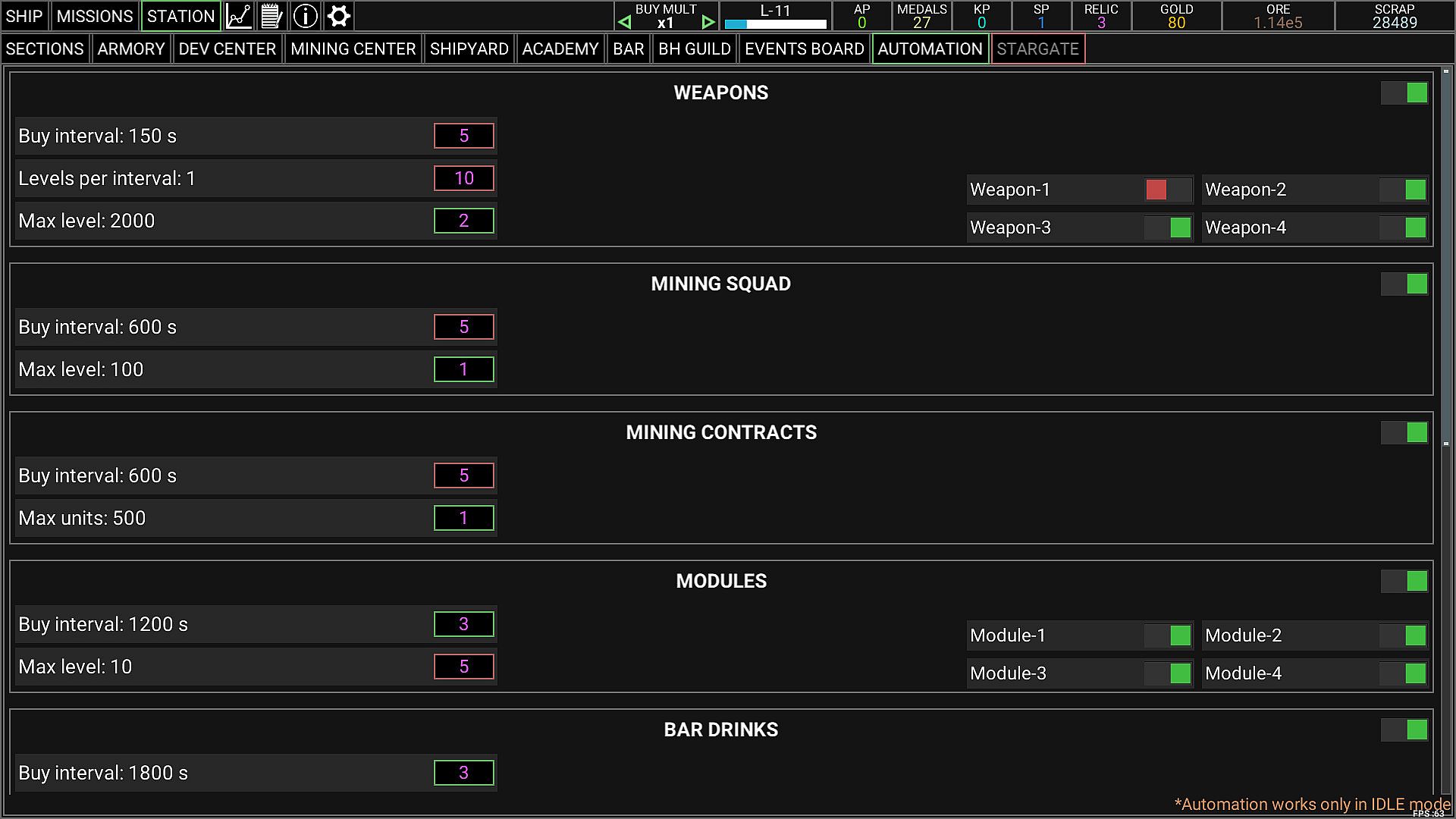 • Automation system with toggles and upgrades in different categories: weapon levels, research levels, bar drinks/mercs, ability use, mining.