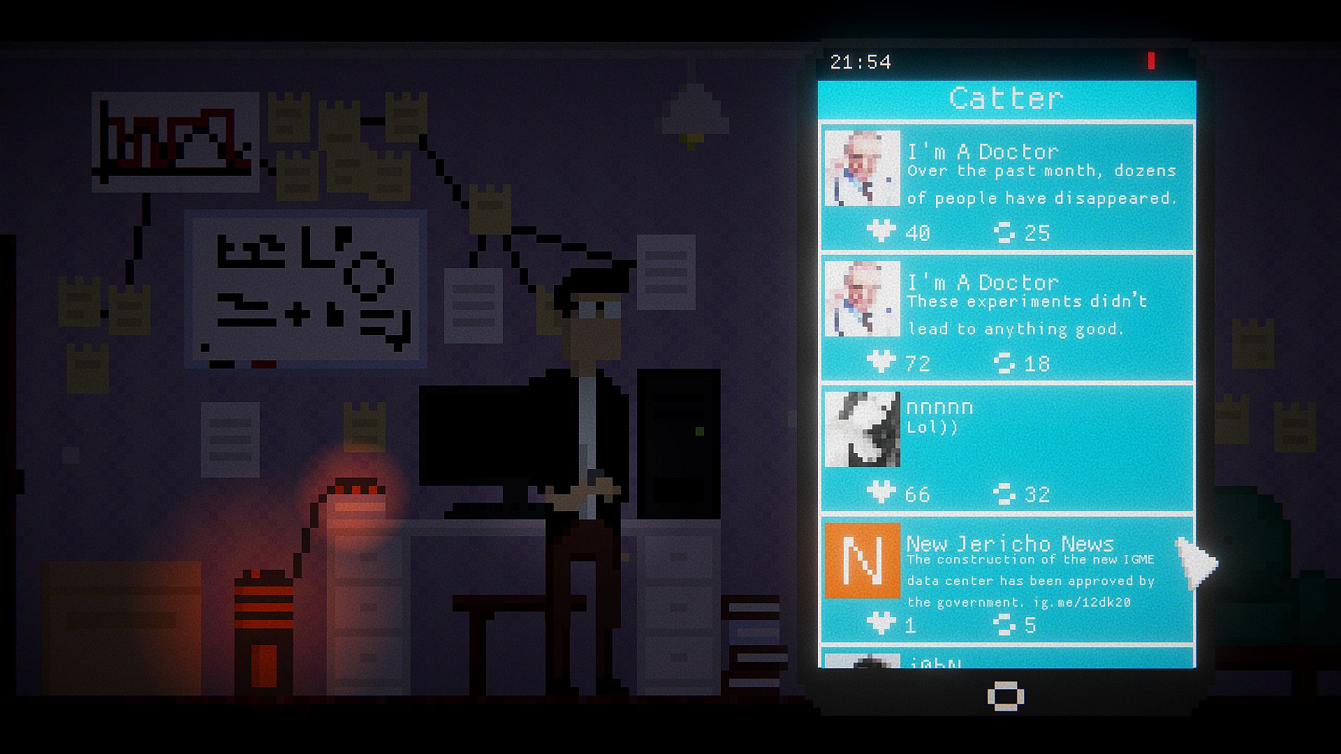 This game is a 2D psychological thriller with adventure game mechanics and focus on the story and atmosphere.