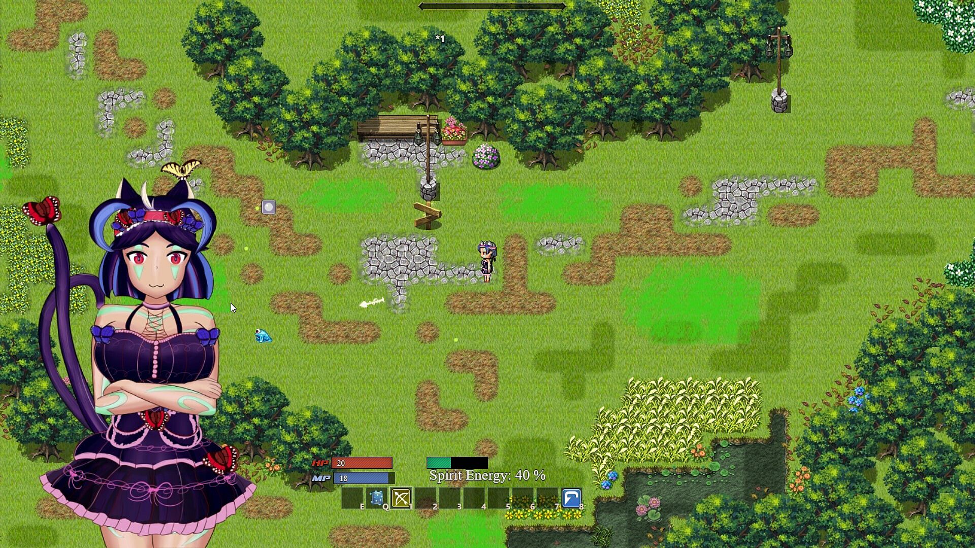 Everything from throwing potions and casting spells to getting laid will increase your combat power! Gather plants and defeat monsters to work on your intelligence and strength, and play around at night to increase your charisma and endurance.