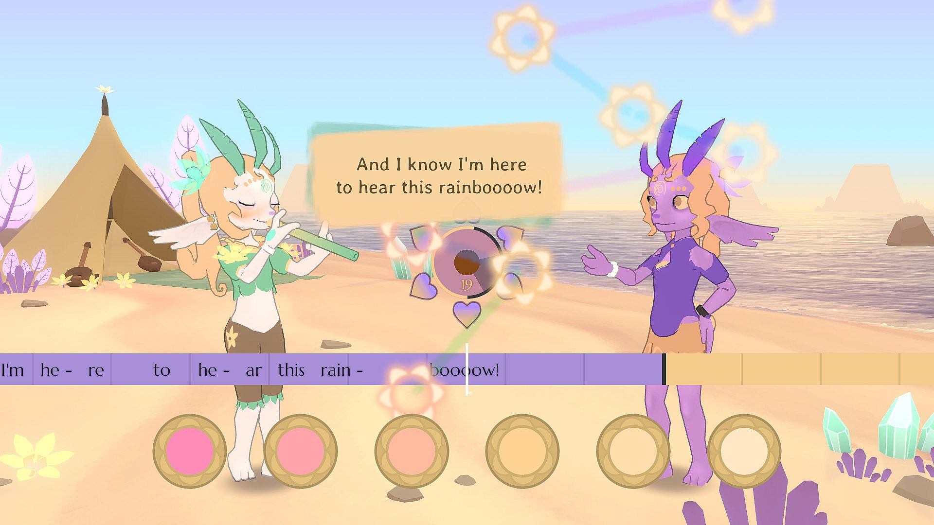 • Mimic melodies using piano-like note buttons, in two 'modes' (light and dark) of six notes each. These play distinct tones that are consistent between songs (eg key 1 always plays a Bb in light mode, an Ab in dark mode).