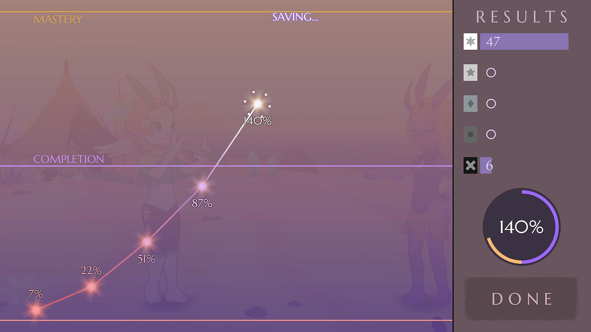 • The challenging difficulty makes success incredibly satisfying! The player's performance is graphed after each attempt, marking clear progress towards a goal. There's also an easier Casual mode.