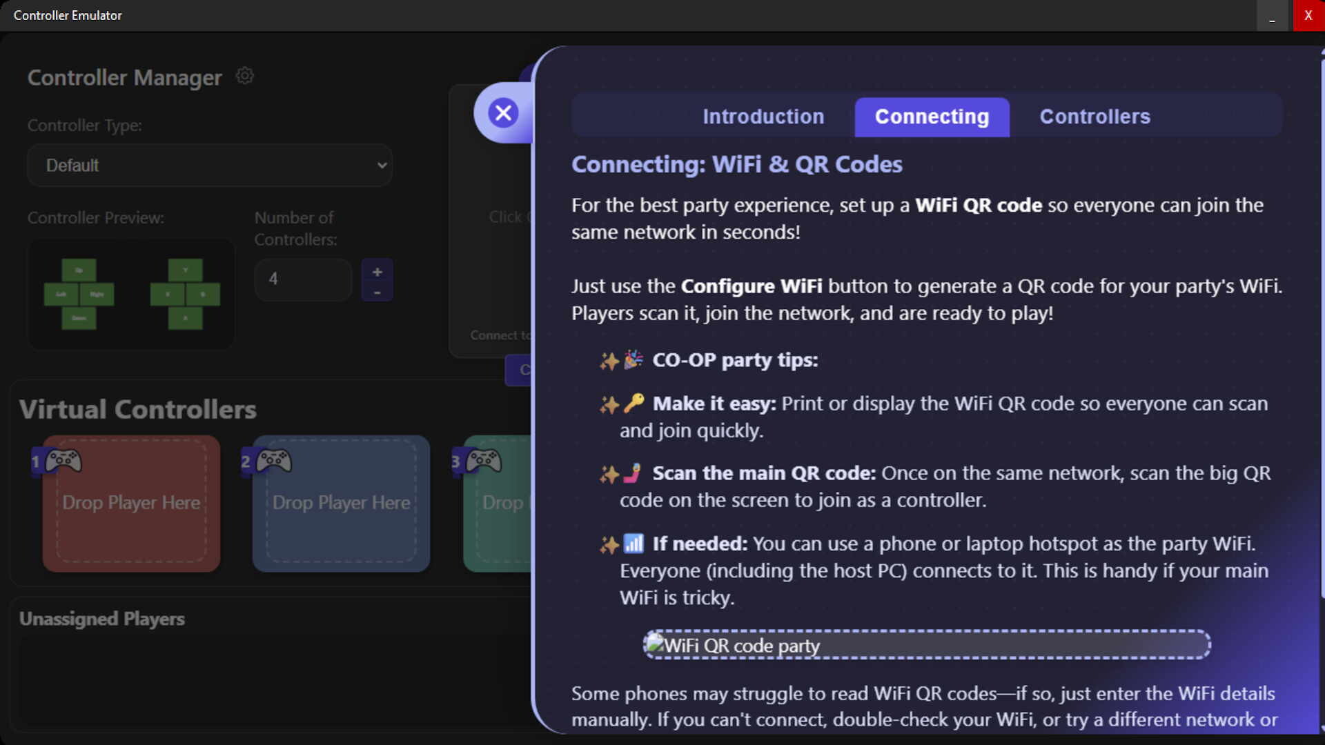 The application itself is an "Admin panel". That lets the user host control how many virtual controllers exist, and which connected players are assigned to which controllers.