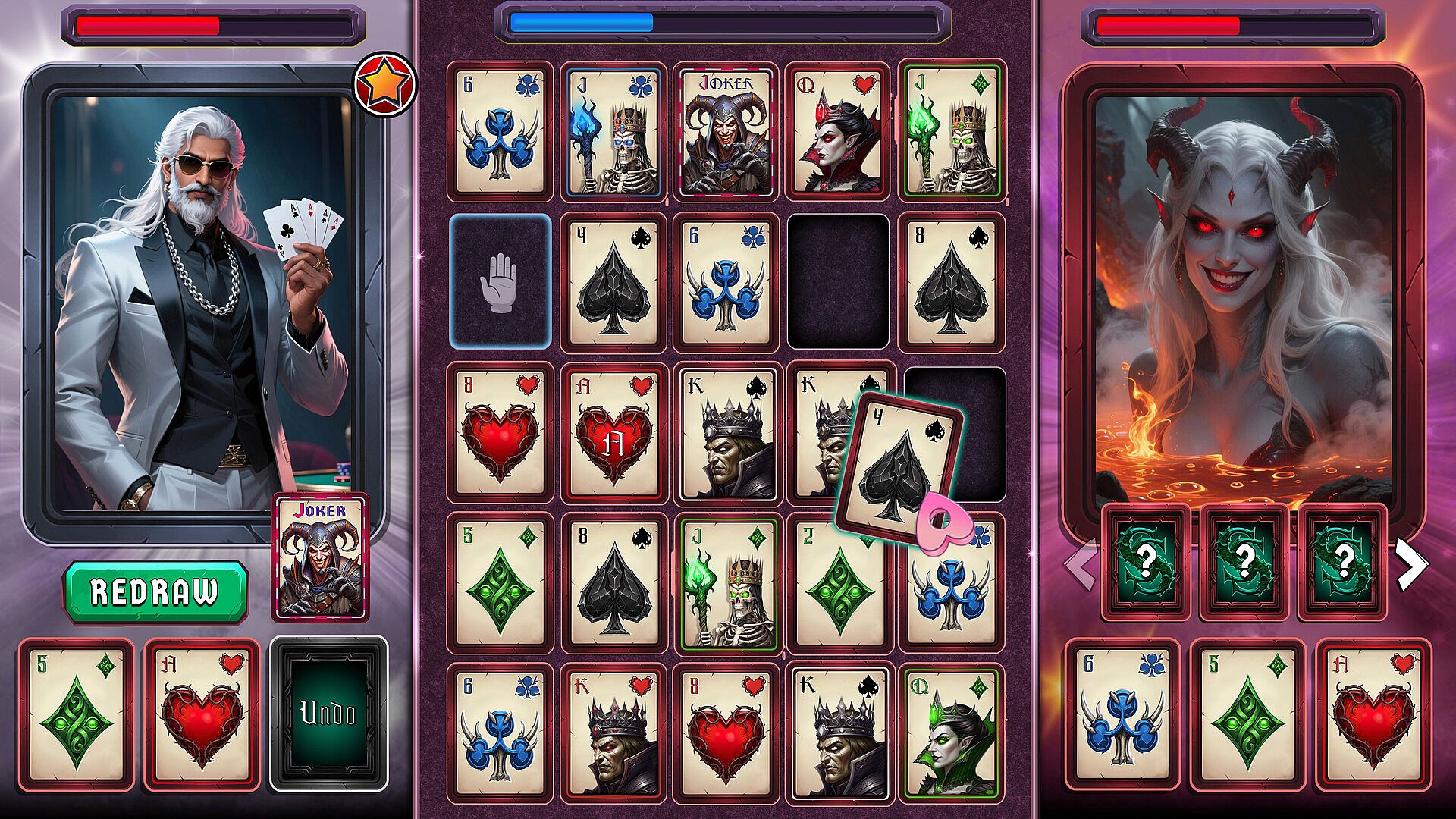 Sinful Shuffle is a casual dark fantasy poker solitaire with an evil twist. A different type of horror-themed card game that will test your skill and strategy. Evil creatures, terrifying demons and sexy succubus will be summoned upon you and test your prowess. As you progress in this hellish fantasy world, will you be able to unlock all possible characters?聽