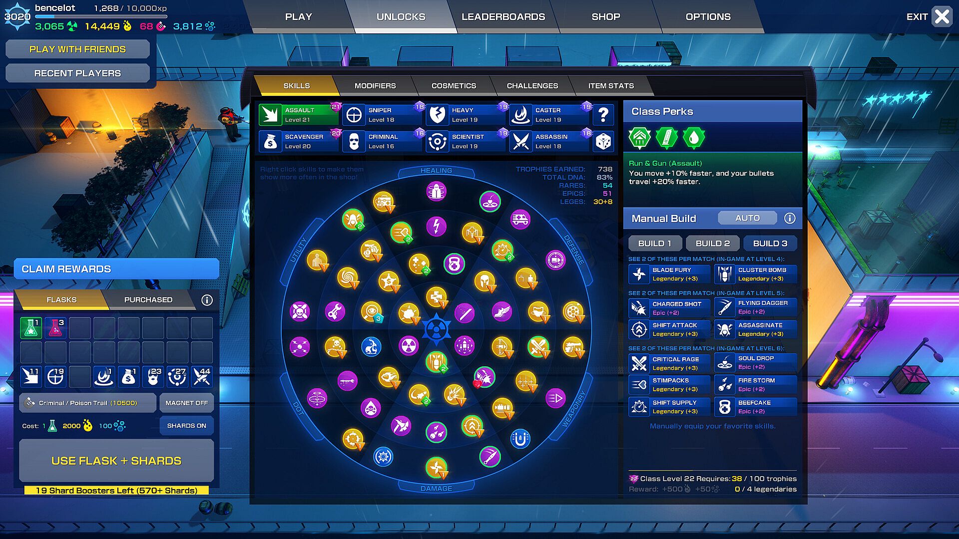 Unlock new abilities between matches. There are over 100 unique skills, classes, and round modifers to unlock. Once unlocked you can equip skills to your build to make them appear more often in-game. Join the community to theorycraft thousands of possible skill combos!