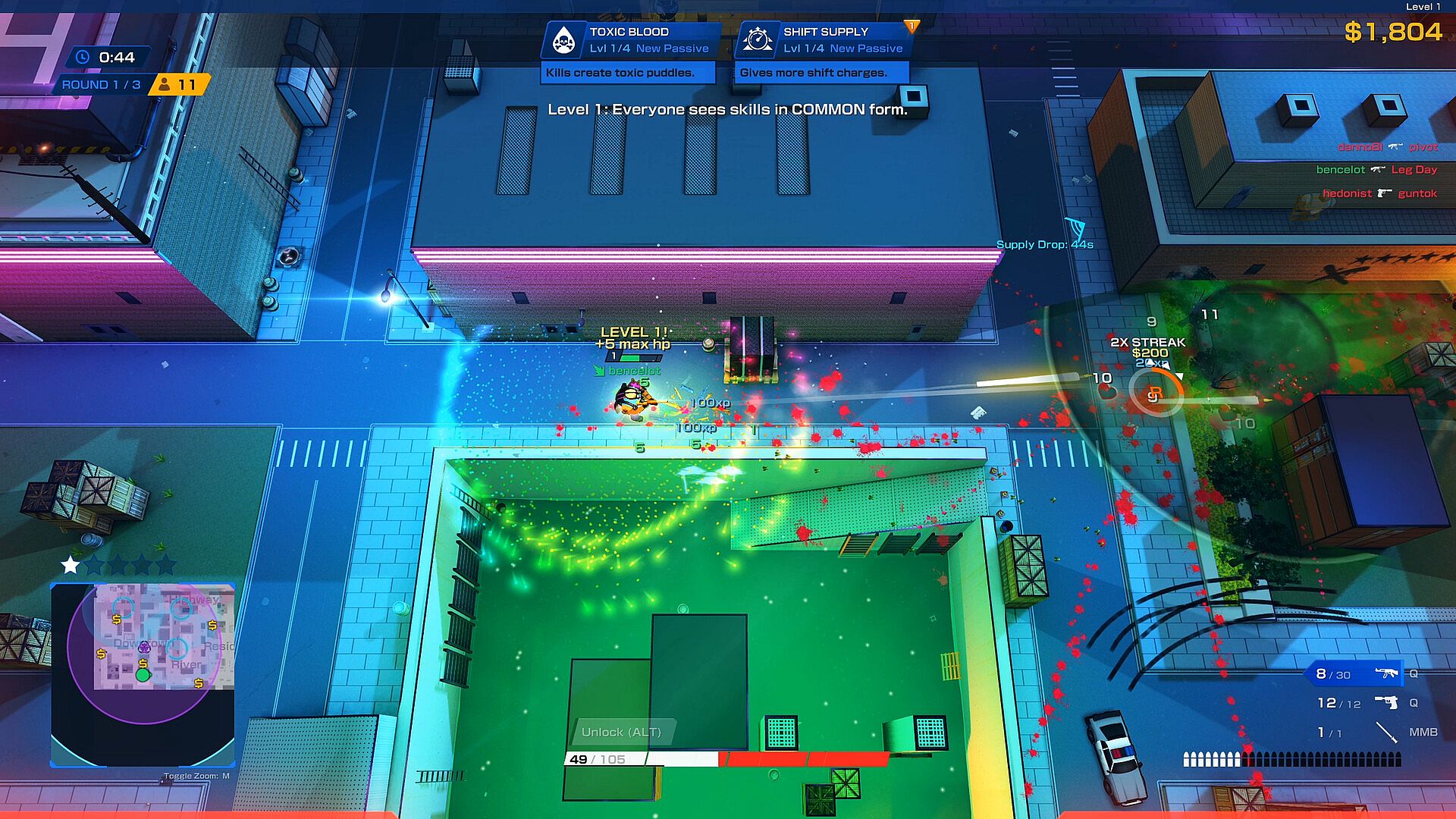 W Skillshot City rabuj, strzelaj, rzucaj czary i gnaj przez chaotyczne bitwy PvP w stylu roguelite. Gracze szybko awansuj膮, zdobywaj膮c punkty umiej臋tno艣ci i draftuj膮c z losowych duet贸w - jak Invisibility czy Bouncing Bullets - by tworzy膰 synergie i pot臋偶ne buildy. Poluj na gliny, gangi, misje i 艂upy, podczas gdy strefa si臋 zaciska, wa偶膮c ryzyko, by przetrwa膰 trzy ultraszybkie rundy i dotrze膰 do fina艂owego starcia. Niesko艅czone respawny pozwalaj膮 zombie tropi膰 ocala艂ych lub zbiera膰 艂upy na nast臋pn膮 rund臋, zapewniaj膮c nieustann膮 akcj臋 w sol贸wkach, triach czy singleplayer/coop survivalu przeciw falom bot贸w. Wybierz jedn膮 z 8 klas i ponad 100 odblokowywalnych umiej臋tno艣ci, by dostosowa膰 buildy wp艂ywaj膮ce na decyzje w grze. Fani casualowych indyk贸w pokochaj膮 ten free-to-play tytu艂 w Early Access za b艂yskawiczne mecze, natychmiastowe do艂膮czanie i niesko艅czone kombinowanie combo.
