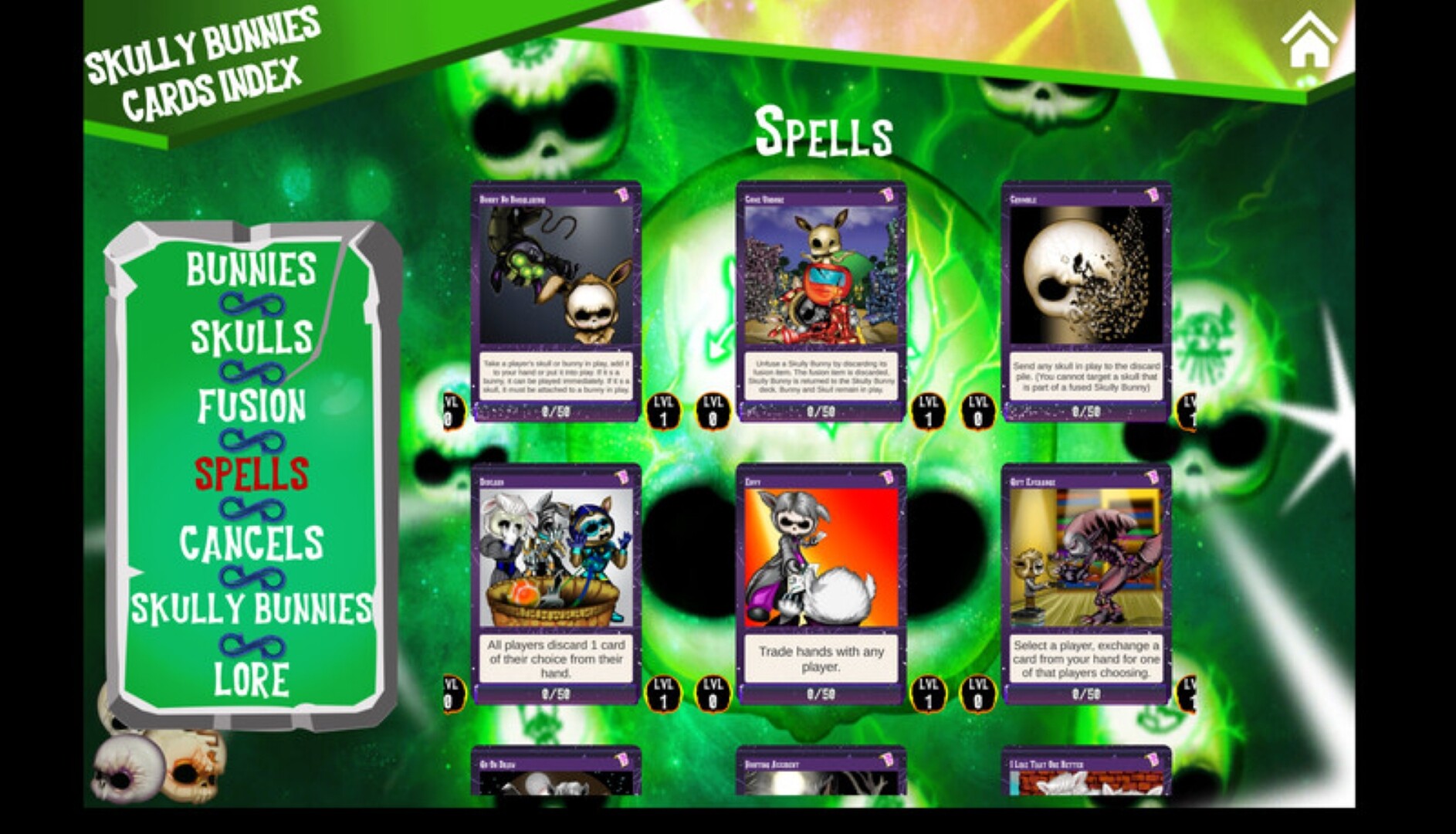 2.) Other spell cards force players to discard a card or steal one of their cards in play. Spell-Cancel cards are used to stop a card from being played. This only works on bunnies, skulls, fusion items, spells and spell-cancel cards but not Skully Bunnies or Super Outta Luck spell-cancel cards. Super Outta Luck cards are limited to four per deck and once used are removed from the game.