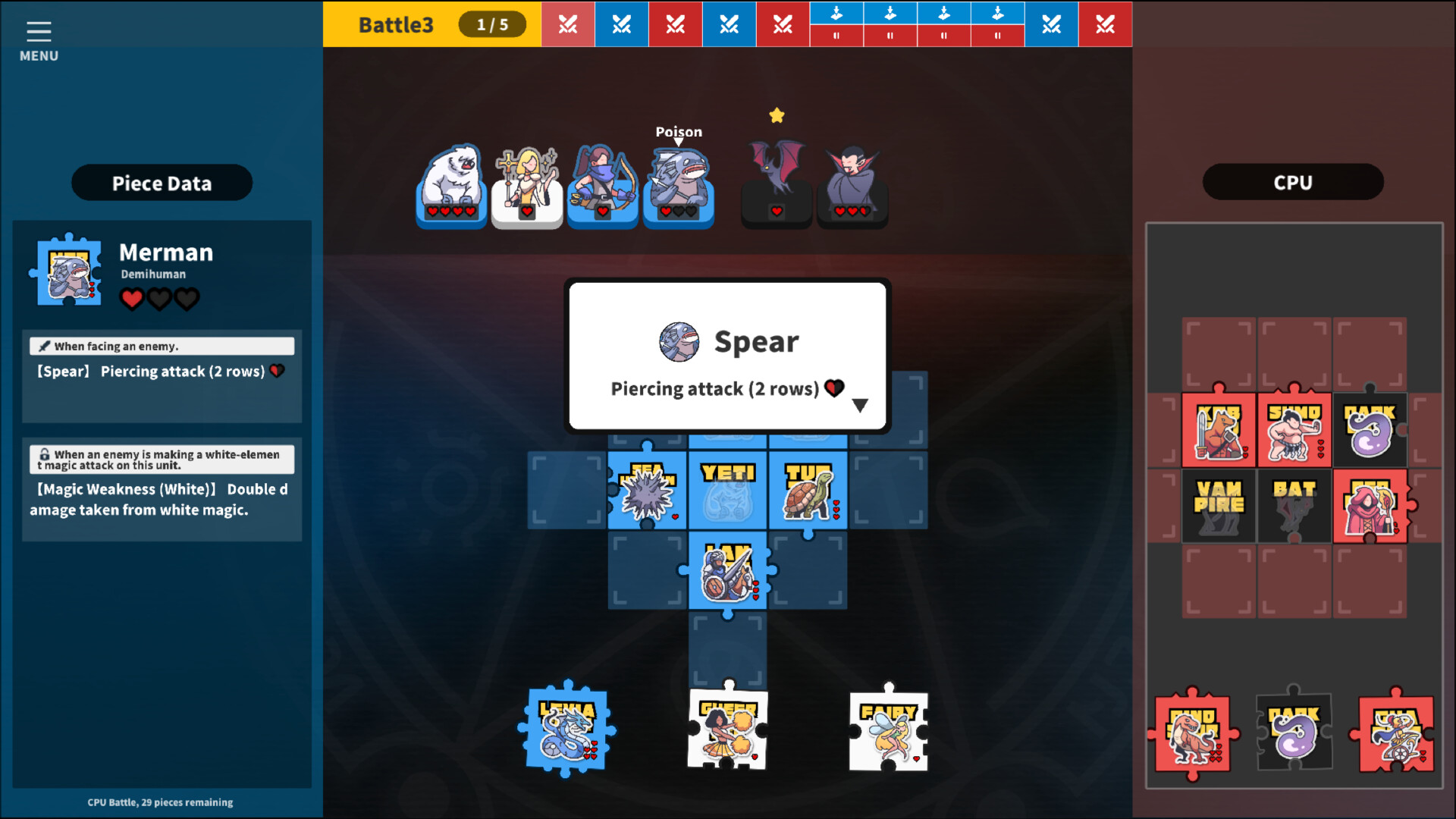 There are also neutral pieces with no elemental attribute. They consist of common shapes only, making them easier to include in any deck.