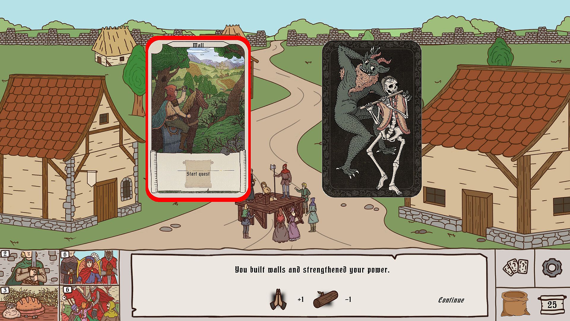 Each of the two decks provides two choices, and all subsequent cards after that choice affect one of the four resources more significantly, while the others are affected to a lesser extent. So, after choosing one of the two decks, you're essentially selecting one of two branches—there are four branches in total. To gain access to the other deck, you need to pick the second option in the dialogue on almost every card, except for the first ones.