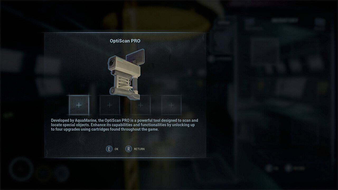 The 'OptiScan PRO' is a technology developed exclusively by AquaMarine to essentially extract data from machines without a direct connection. The equipment comes with 4 slots for upgrades; you can enhance it with a flashlight, night vision, and much more to improve your gameplay.