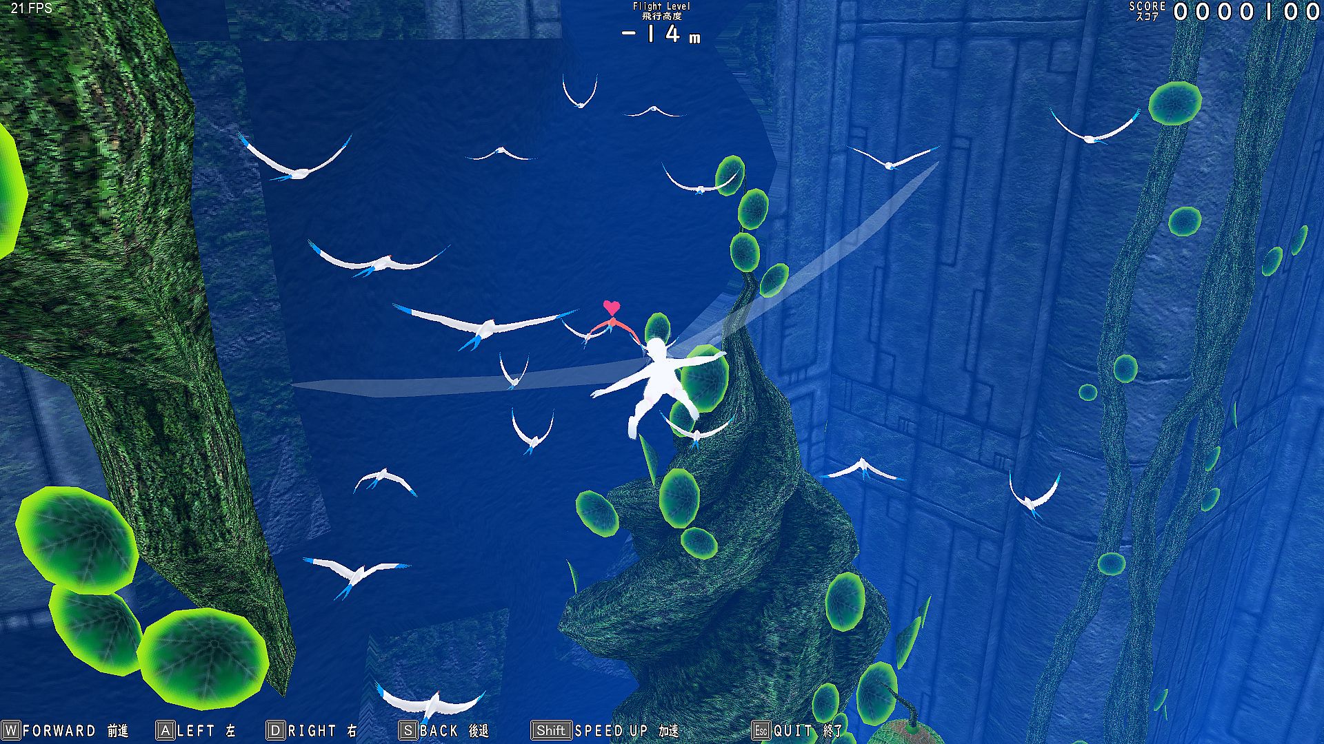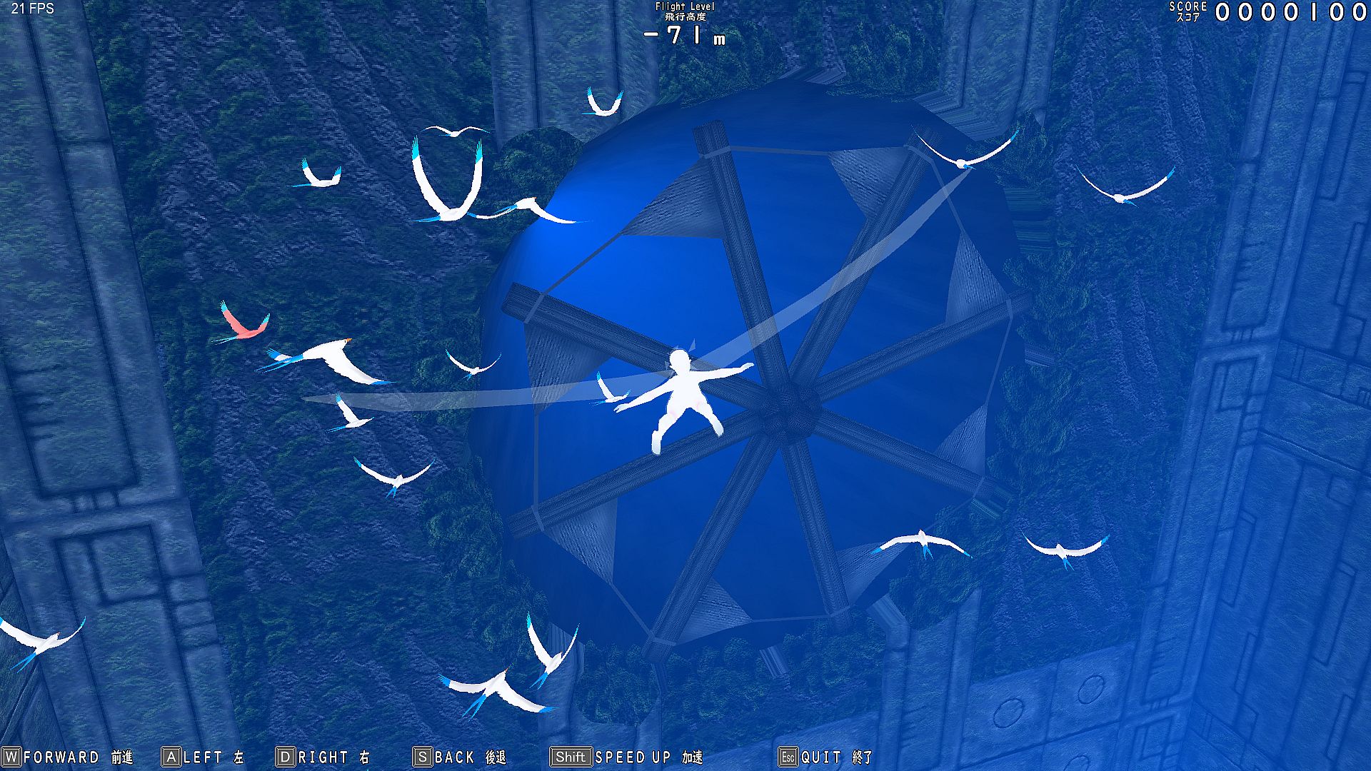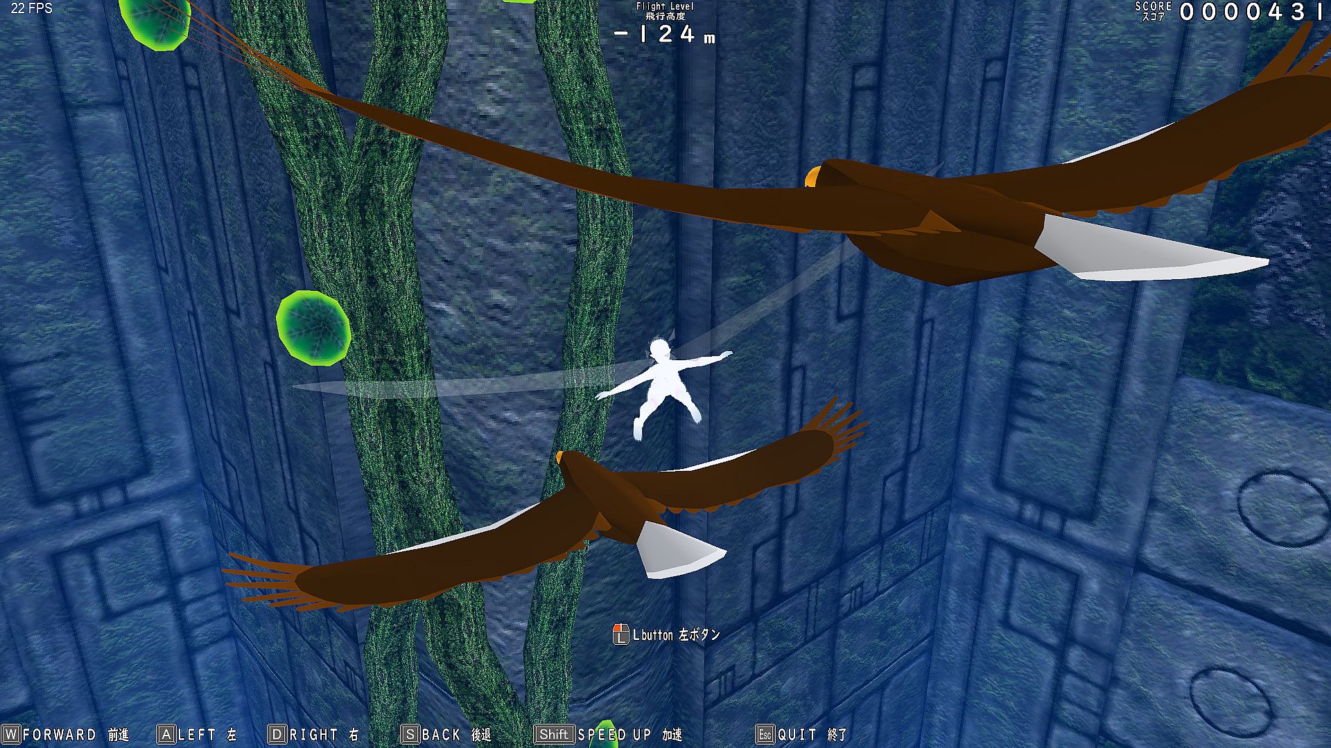 Glide endlessly through infinite vertical holes as Gar Gooyo Lilienthal, a winged girl descending a bottomless cave filled with birds and flowers. Score points by approaching these elements while operating structures to reach new areas in this simple action adventure game. Use keyboard (WASD, SHIFT, R, Esc) or gamepad to move, speed up, interact, and recover from collisions by turning into a soap bubble.